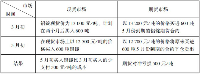 由此可见,该铝型厂在2个月后买入铝锭比3月初买入少支付了500元/吨,但由于在期货市场上做了买入保值,期货市场亏损了500元/吨,因此,该铝型材厂铝锭的实际进价成本仍然为13000元/吨,即用现货市场上少支付的500元/吨弥补了期货市场上亏损的500元/吨。