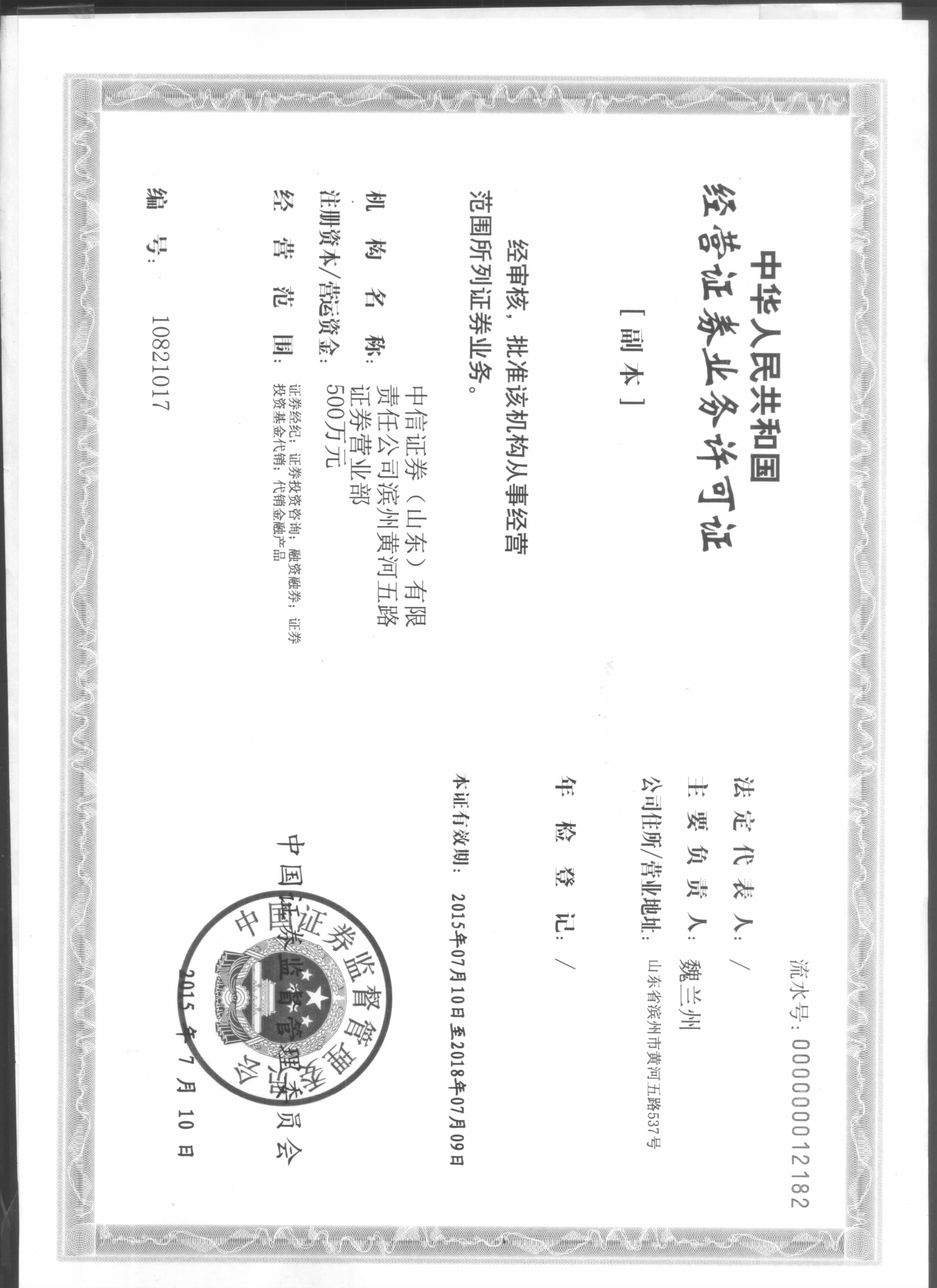 营业部名称 :中信证券(山东)有限责任公司滨州黄河五路证券营业部