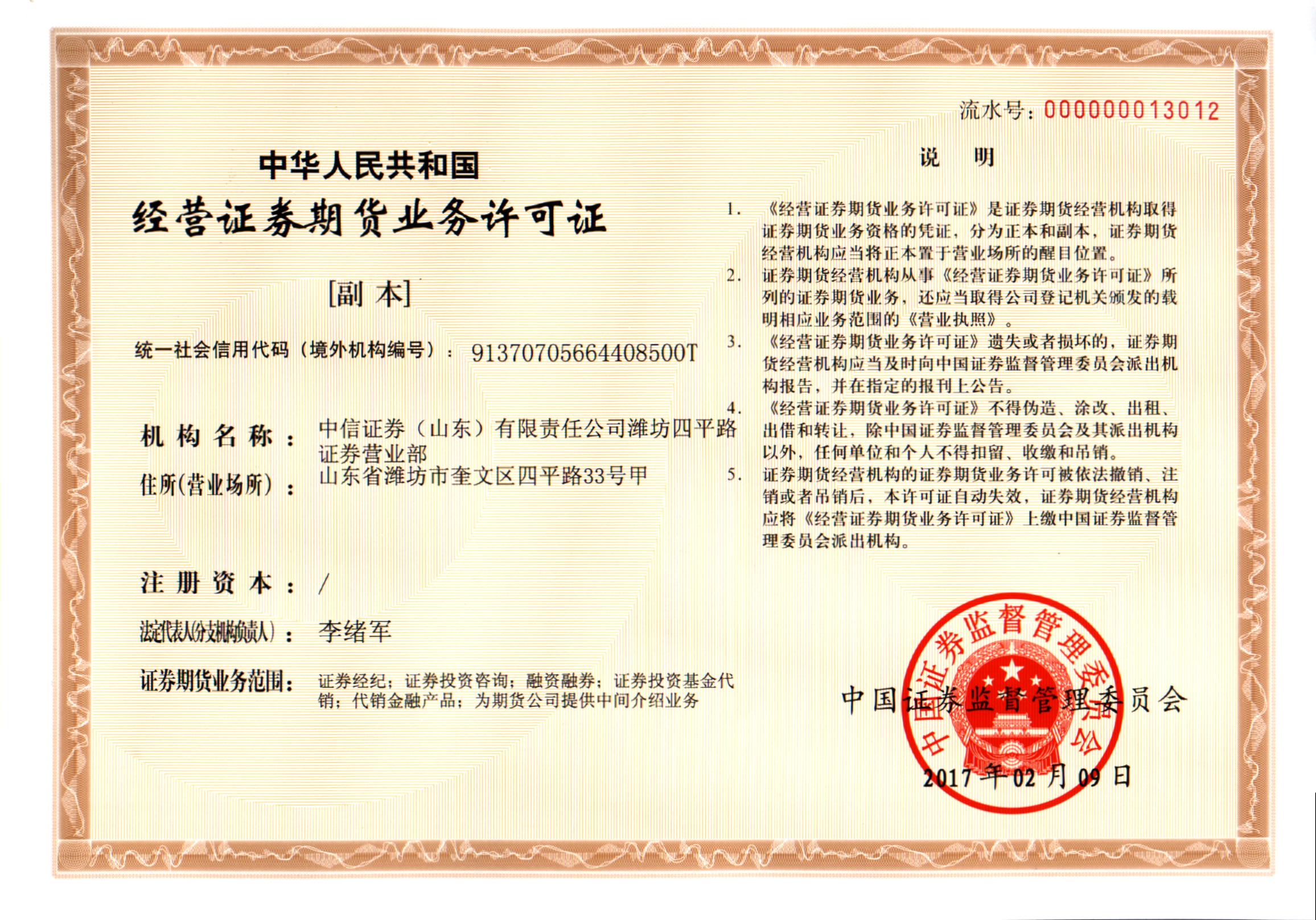 营业部名称:中信证券(山东)有限责任公司潍坊四平路证券营业部