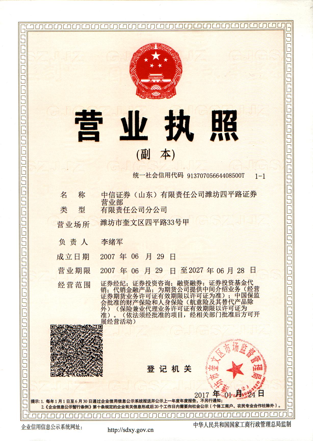 中信证券(山东)有限责任公司潍坊四平路证券营业部