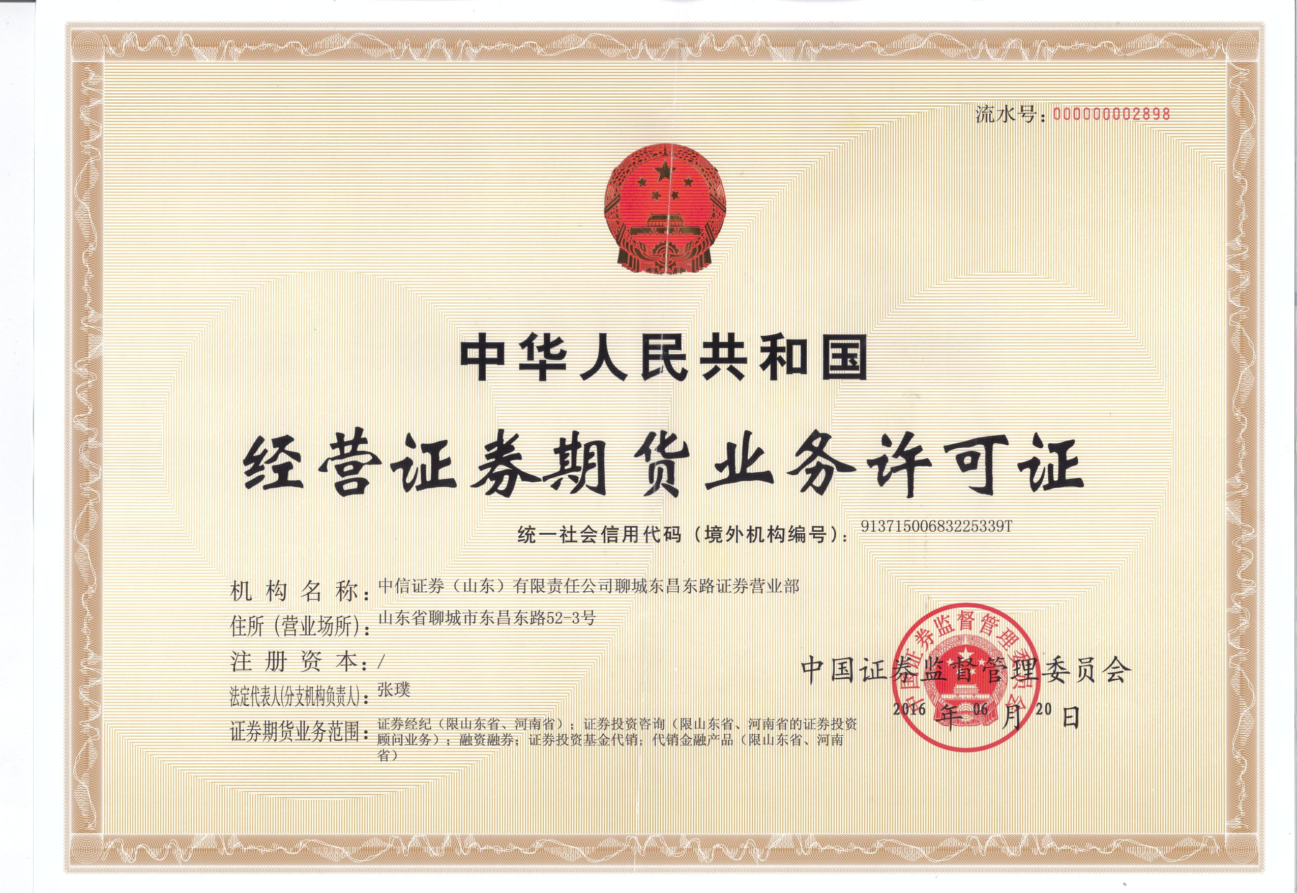 我营业部已向聊城市工商局进行了营业执照变更,并向中国证券监督管理委员会申办换发了《经营证券期货业务许可证》。变更后的营业部具体情况如下: