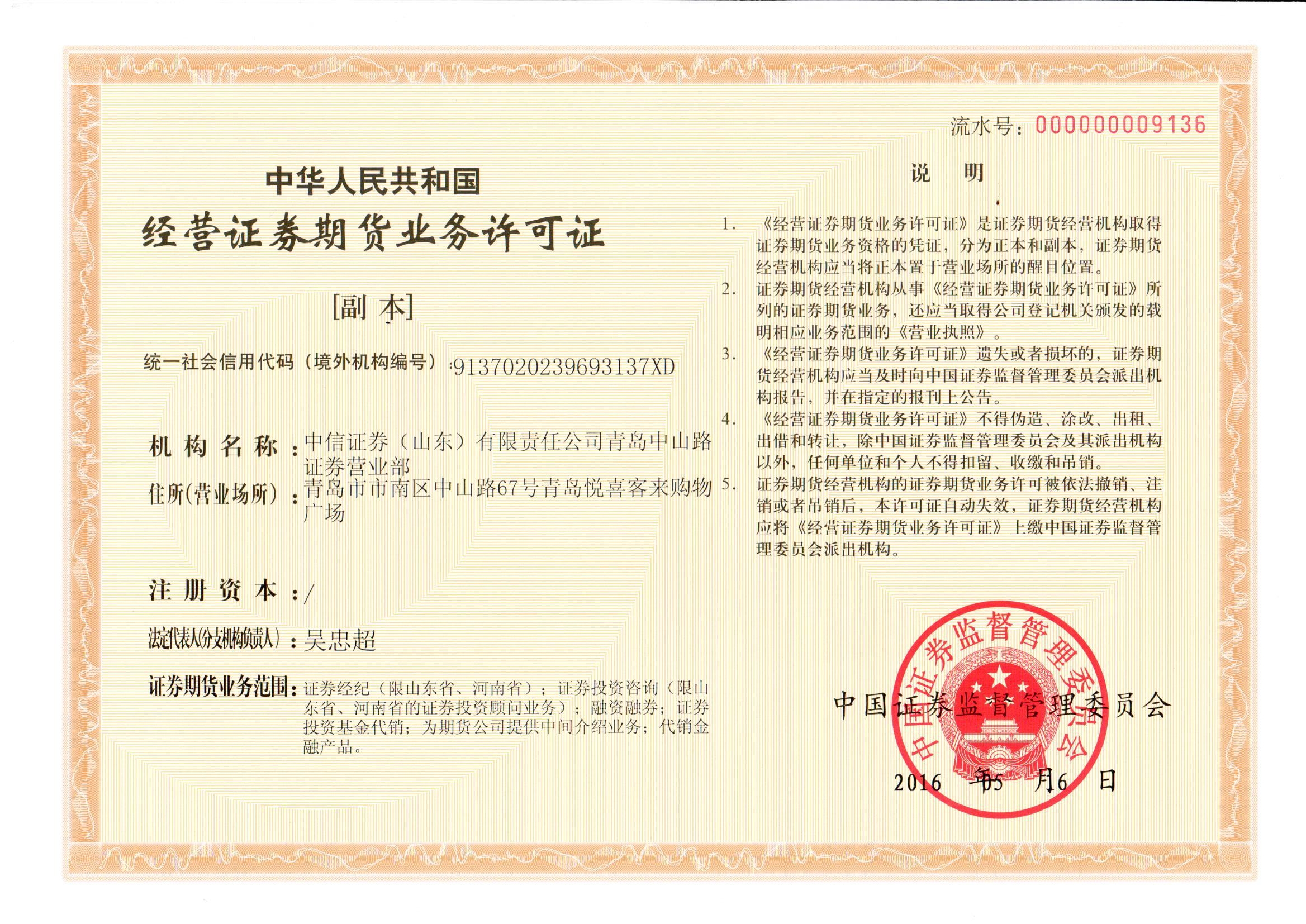 我营业部已向青岛市工商局市南分局进行了营业执照变更,并向中国证券监督管理委员会申办换发了《证券经营机构营业许可证》。变更后的营业部具体情况如下: