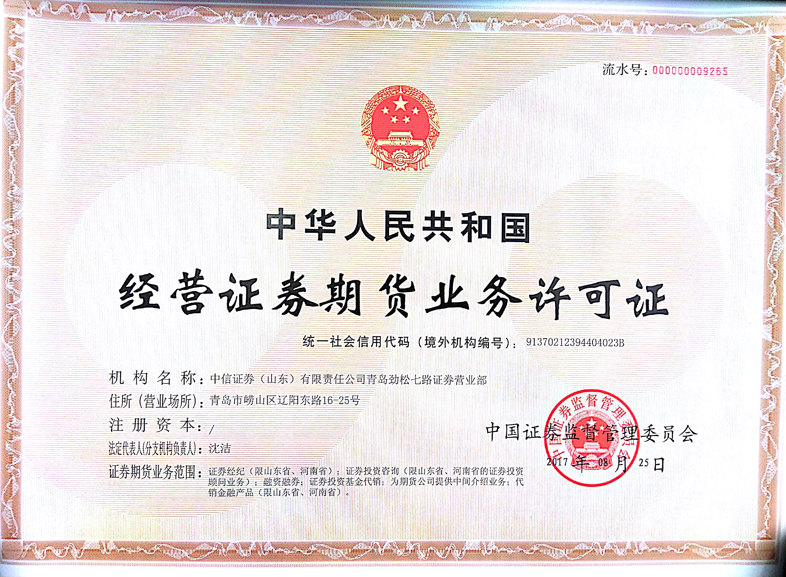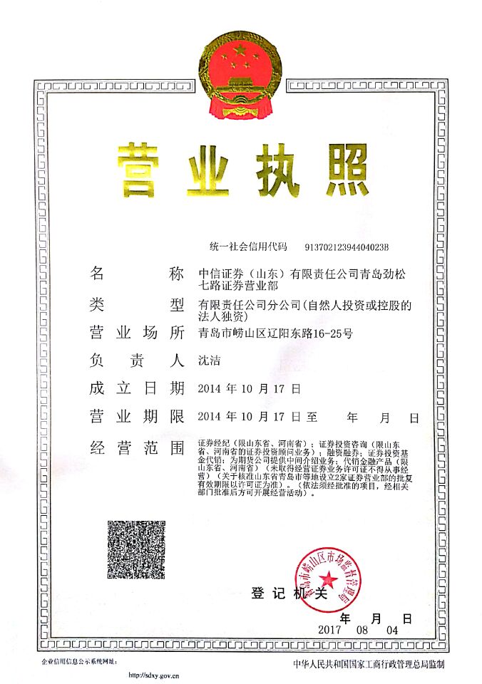 营业部名称:中信证券(山东)有限责任公司青岛劲松七路证券营业部